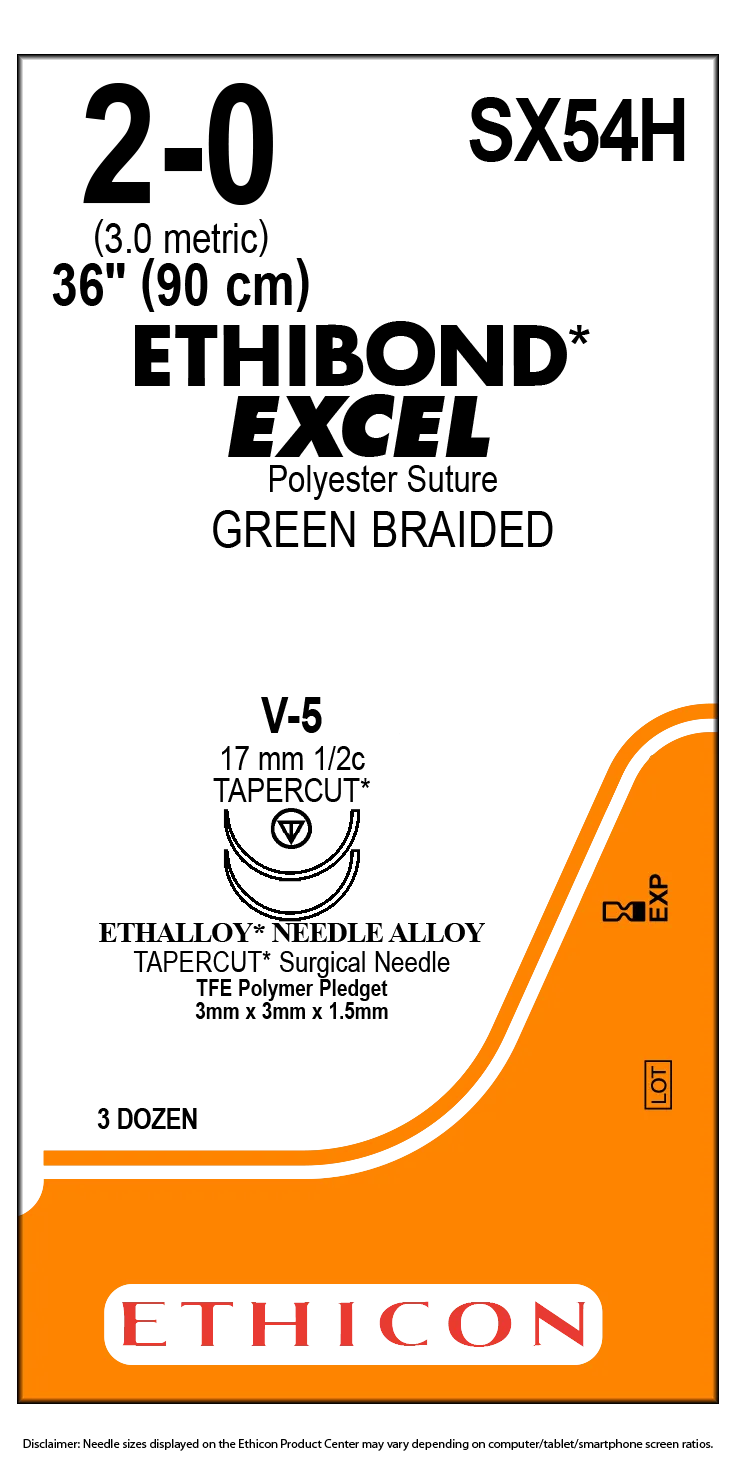 Ethicon Ethibond Sutures USP 2-0, 1/2 Circle Tapercut V-5 Double Needle - SX54H - 12 foils