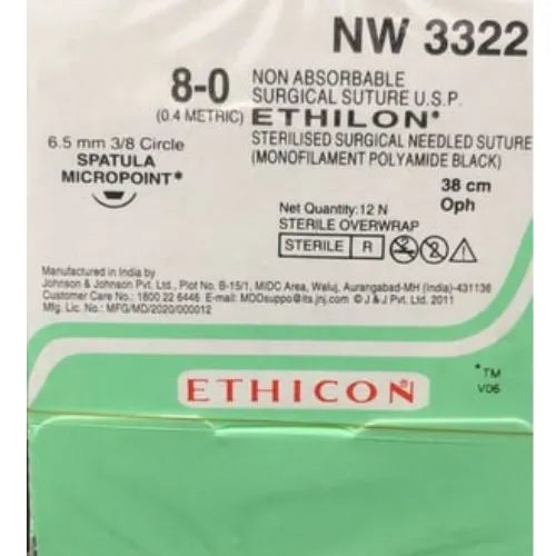 Ethicon Ethilon Sutures USP 8-0, 3/8 Circle Spatulated Mircopoint NW3322 -12 Foils