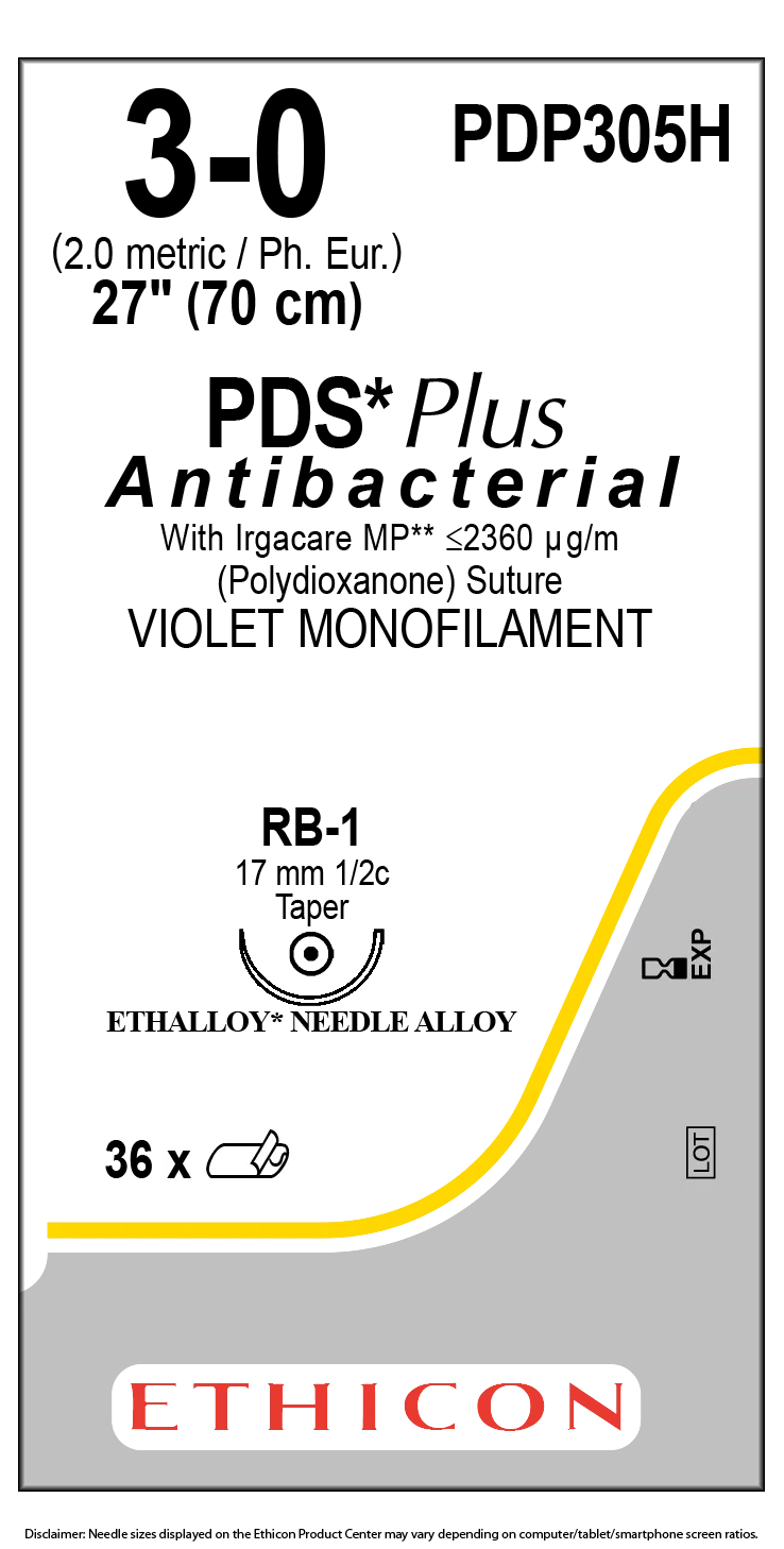 Ethicon PDS Plus Sutures USP 3-0, 17 mm 1/2 Circle Taper Point RB-1 - PDP305H