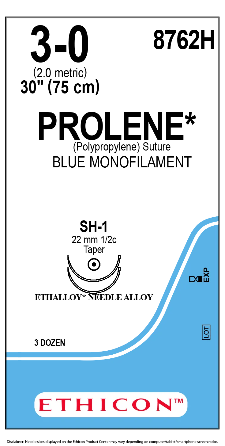 Ethicon Prolene Sutures USP 3-0, 1/2 Circle Taper Point SH-1 Ethalloy Double Needle 8762H