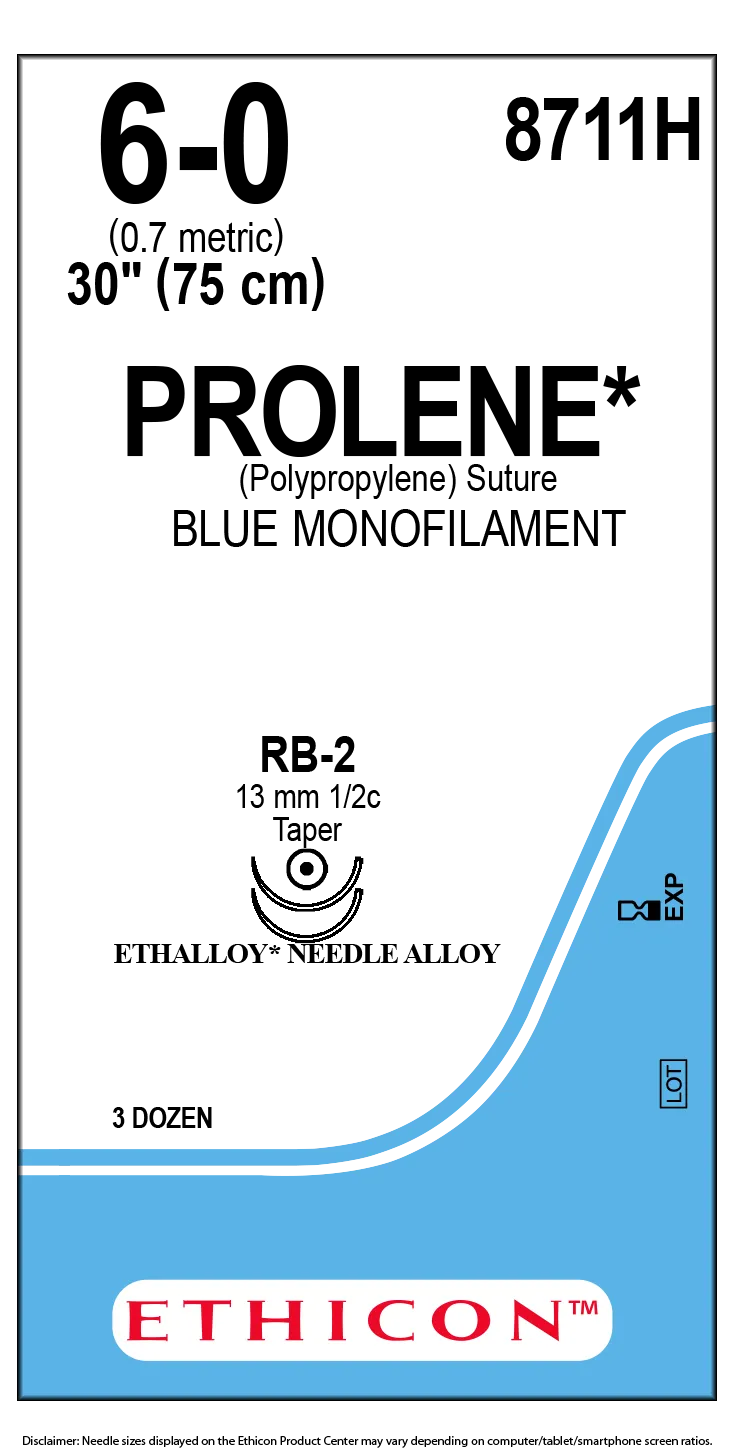 Ethicon Prolene Sutures USP 6-0, 1/2 Circle Round Body RB-2 Double Needle 8711H