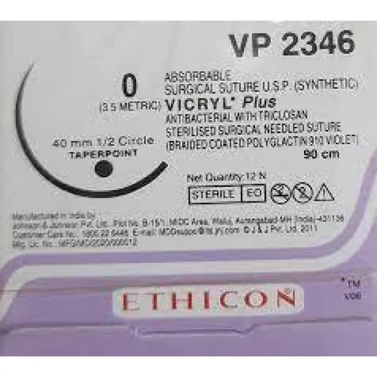 Ethicon Vicryl Plus VP 2346Needle Length: 40mmSuture Length: 90cmColour: VioletSuture Type: Synthetic BraidedAbsorption Profile: Absorbable : 56 - 70 Da