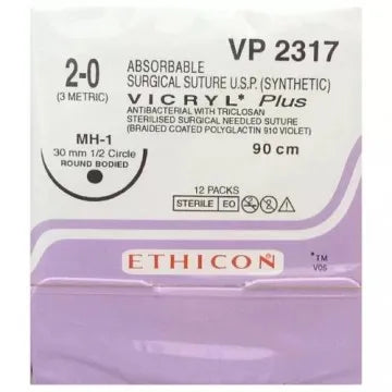 BOX OF 12 FOILSEthicon Vicryl Plus 2-0 VP 2317 Round Bodied Surgical SutureNeedle Length: 30mmSuture Length: 90 cmNeedle Description: 30mm, 1/2 Circle R