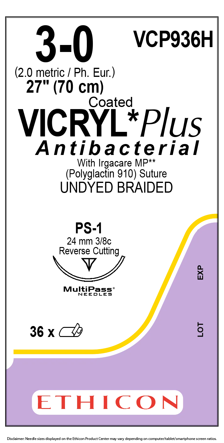 Ethicon Vicryl Plus Sutures USP 3-0, 3/8 Circle Cutting PS-1 Prime Multi Pass Ethalloy - VCP936H